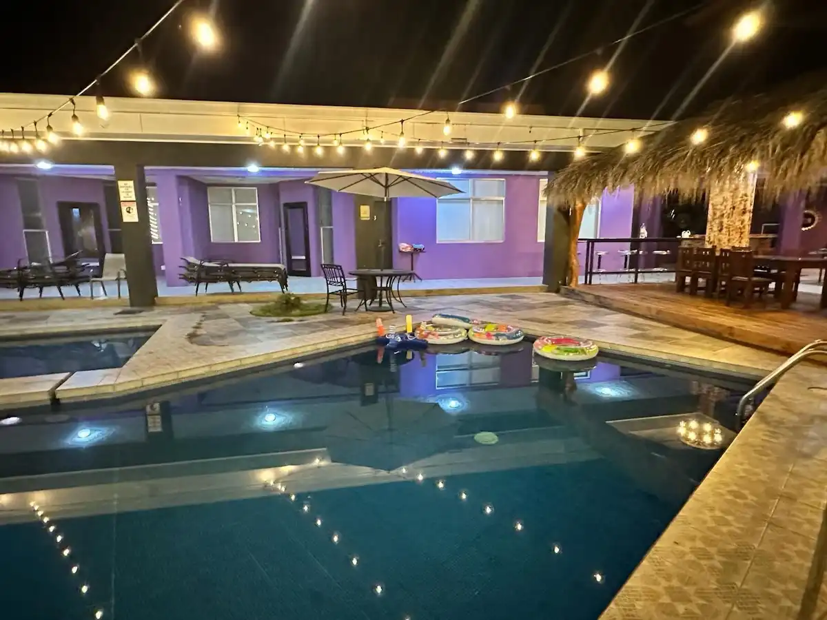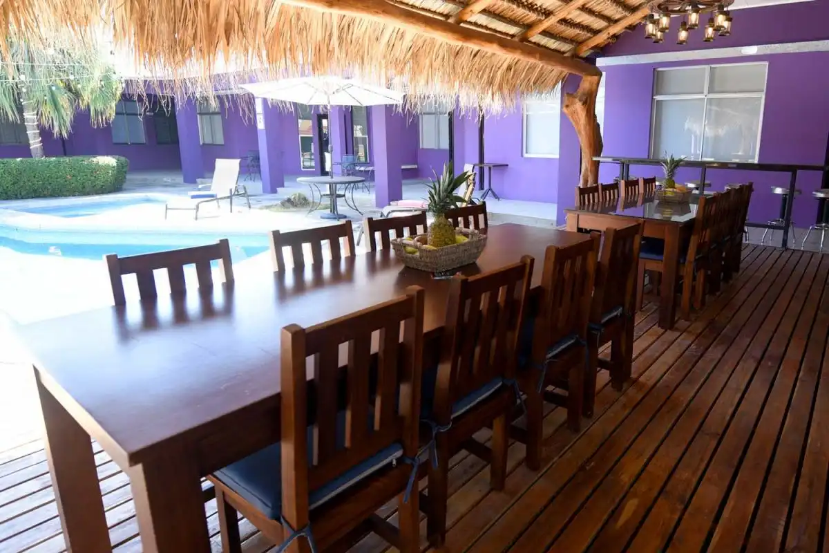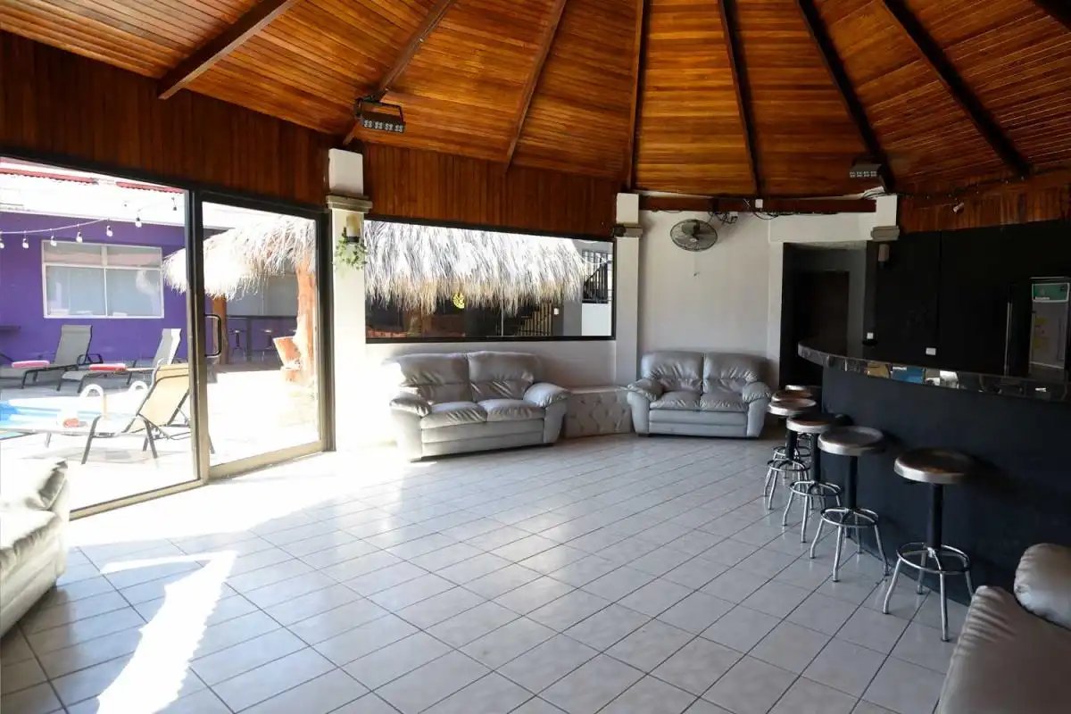 Right outside the sliding glass doors of the main house are two large dining tables underneath a rancho. The tables and rancho are facing the pool and spectacular views. There is a half bathroom next to the pool/rancho area. Next to the rancho is the disco! An air-conditioned party room with AC, TV, wet bar, seating, sound system and lighting.
