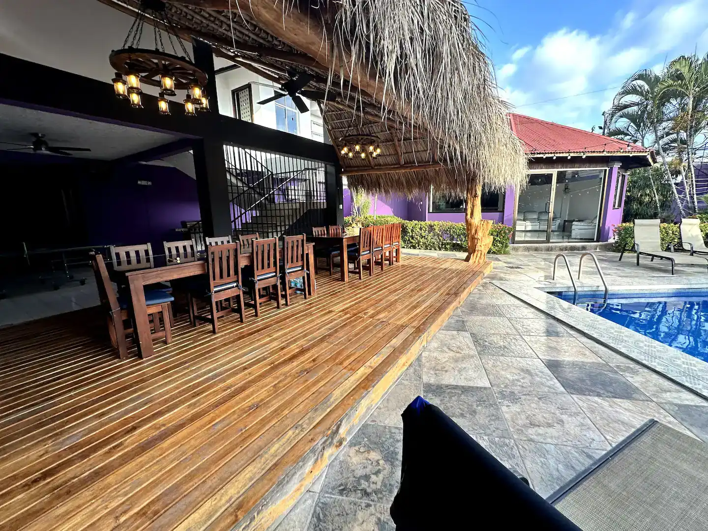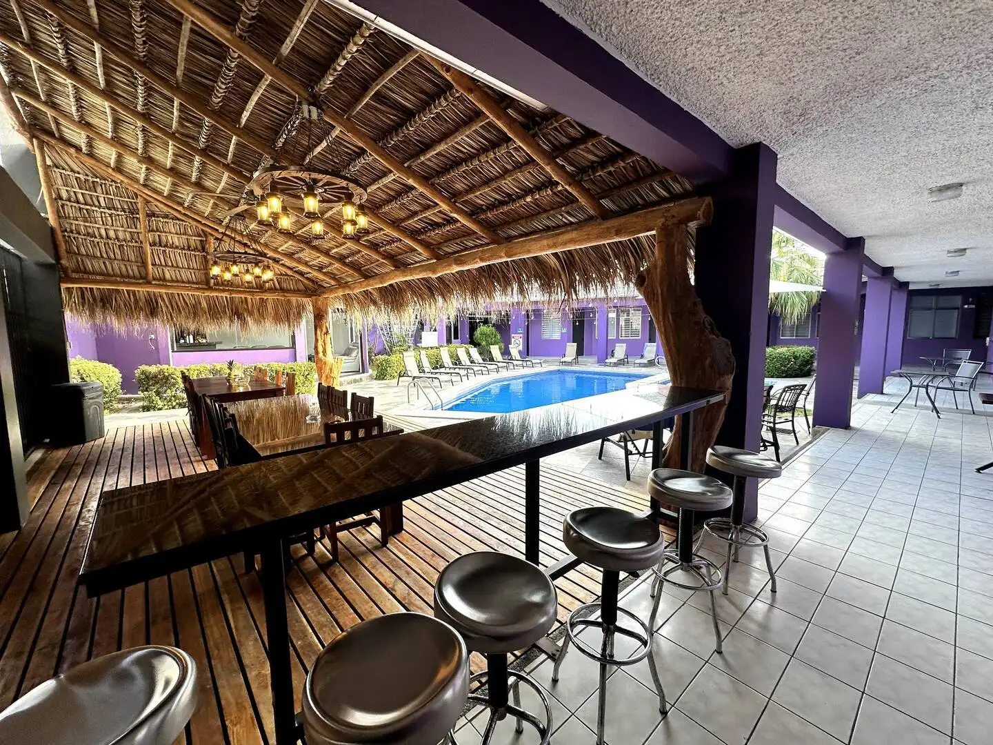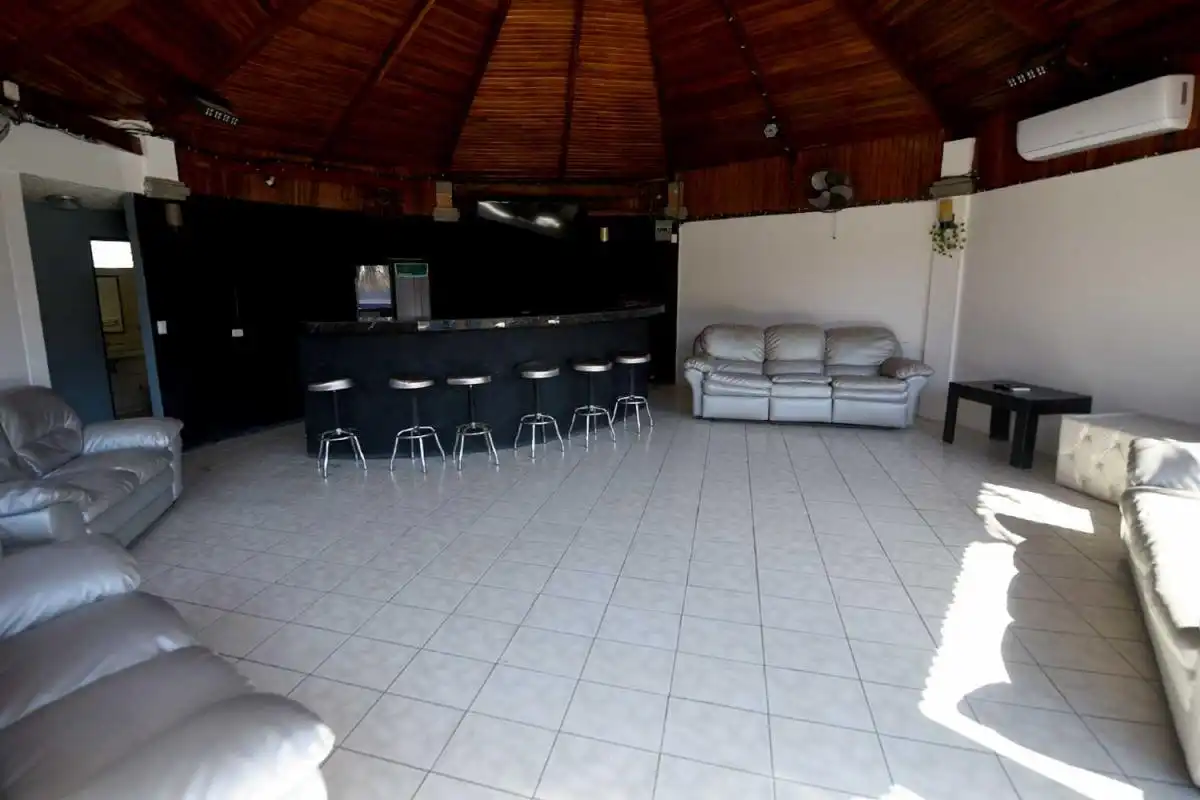 Right outside the sliding glass doors of the main house are two large dining tables underneath a rancho. The tables and rancho are facing the pool and spectacular views. There is a half bathroom next to the pool/rancho area. Next to the rancho is the disco! An air-conditioned party room with AC, TV, wet bar, seating, sound system and lighting.